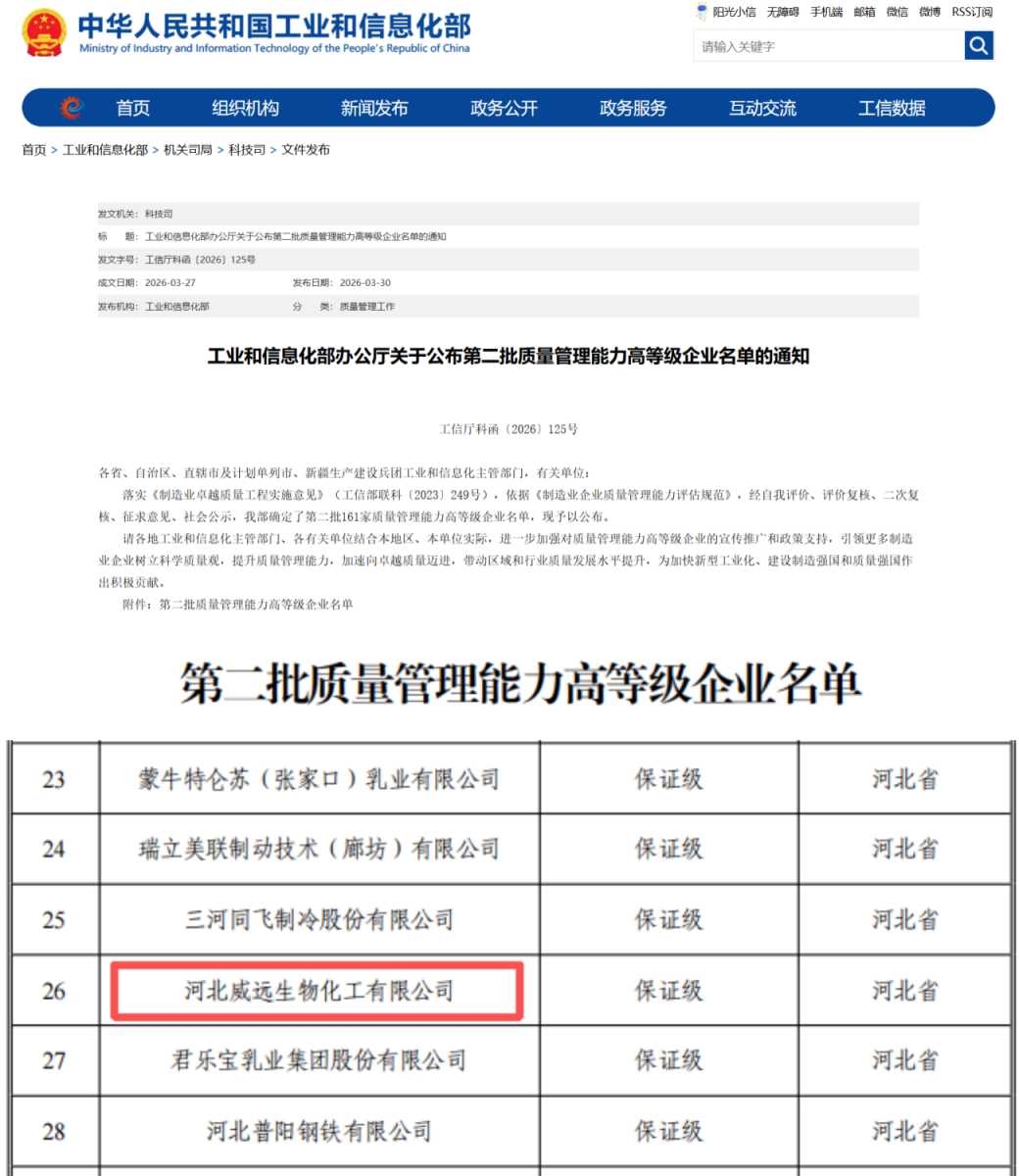 3月30日,工业和信息化部公布第二批质量管理能力高等级企业名单。集团子公司威远生化成功跻身国家级质量管理标杆企业行列,荣获质量管理能力“保证级”企业认定。